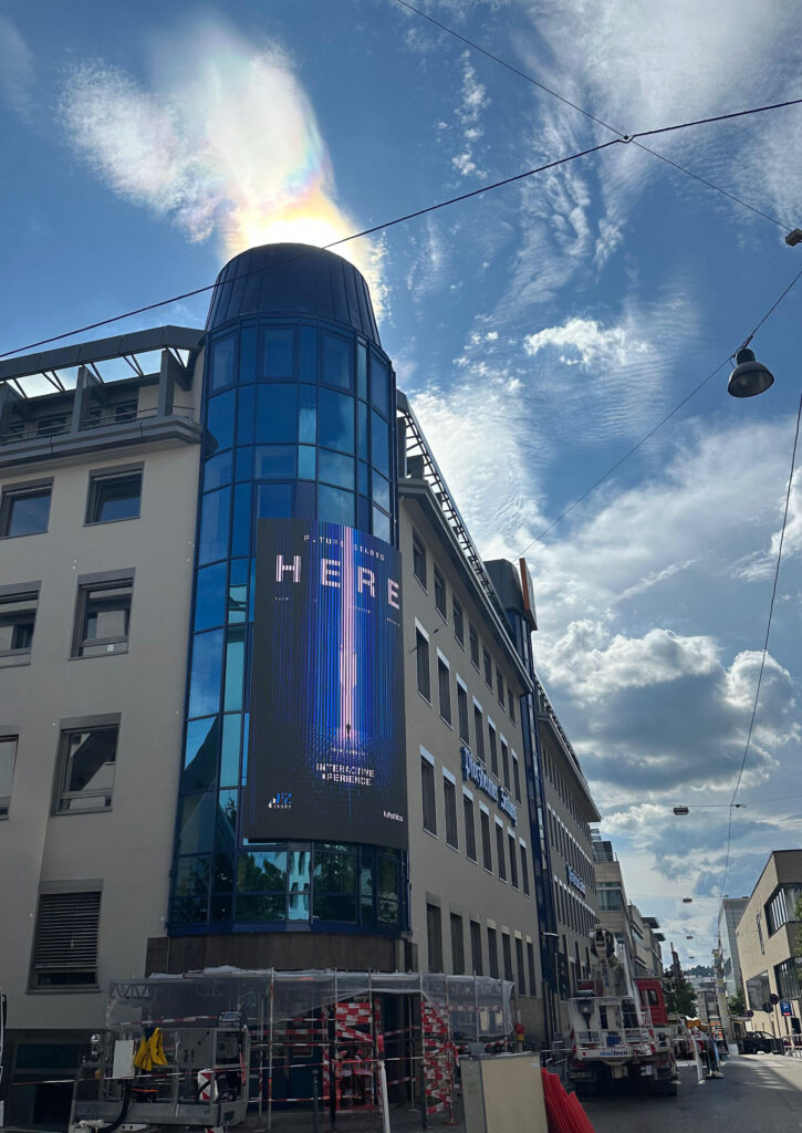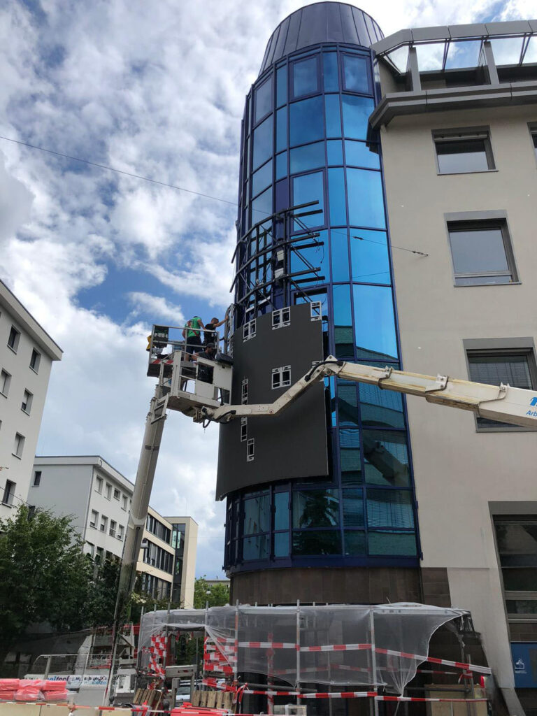 The main challenge was to make the screen fit the curved shape of the facade exactly. We managed this by doing some precise laser measurements beforehand. Based on this, we came up with a special design that's anchored behind the glass facade using existing columns.